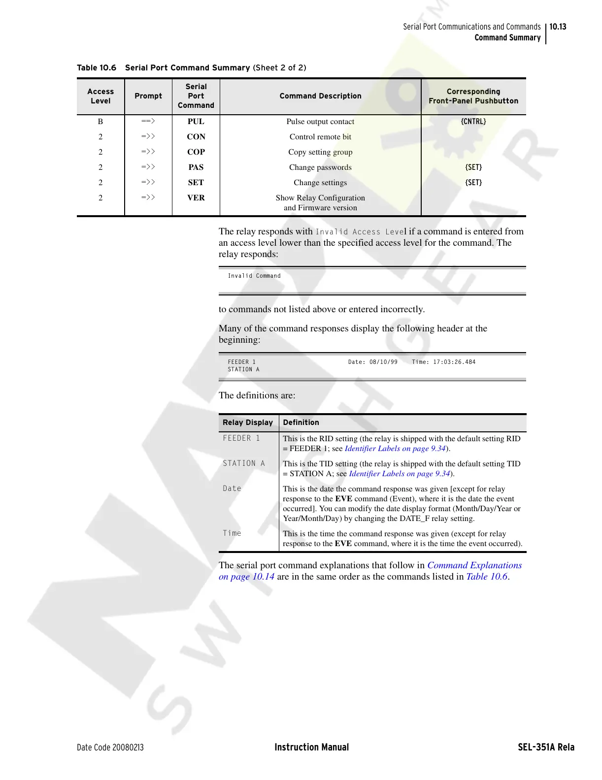The relay responds with Invalid Access Level if a command is entered from