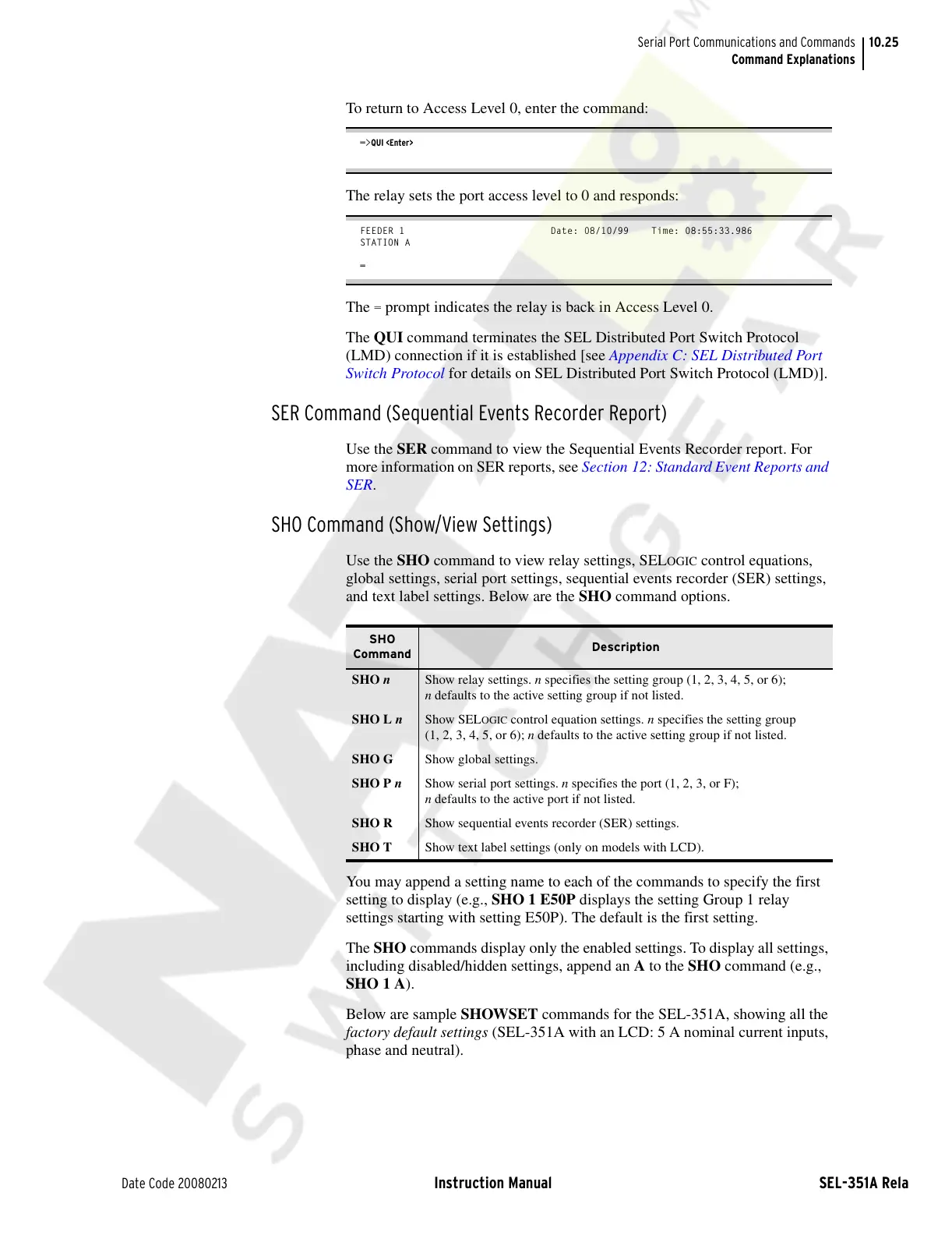 Use the SHO command to view relay settings, SELOGIC control equations,