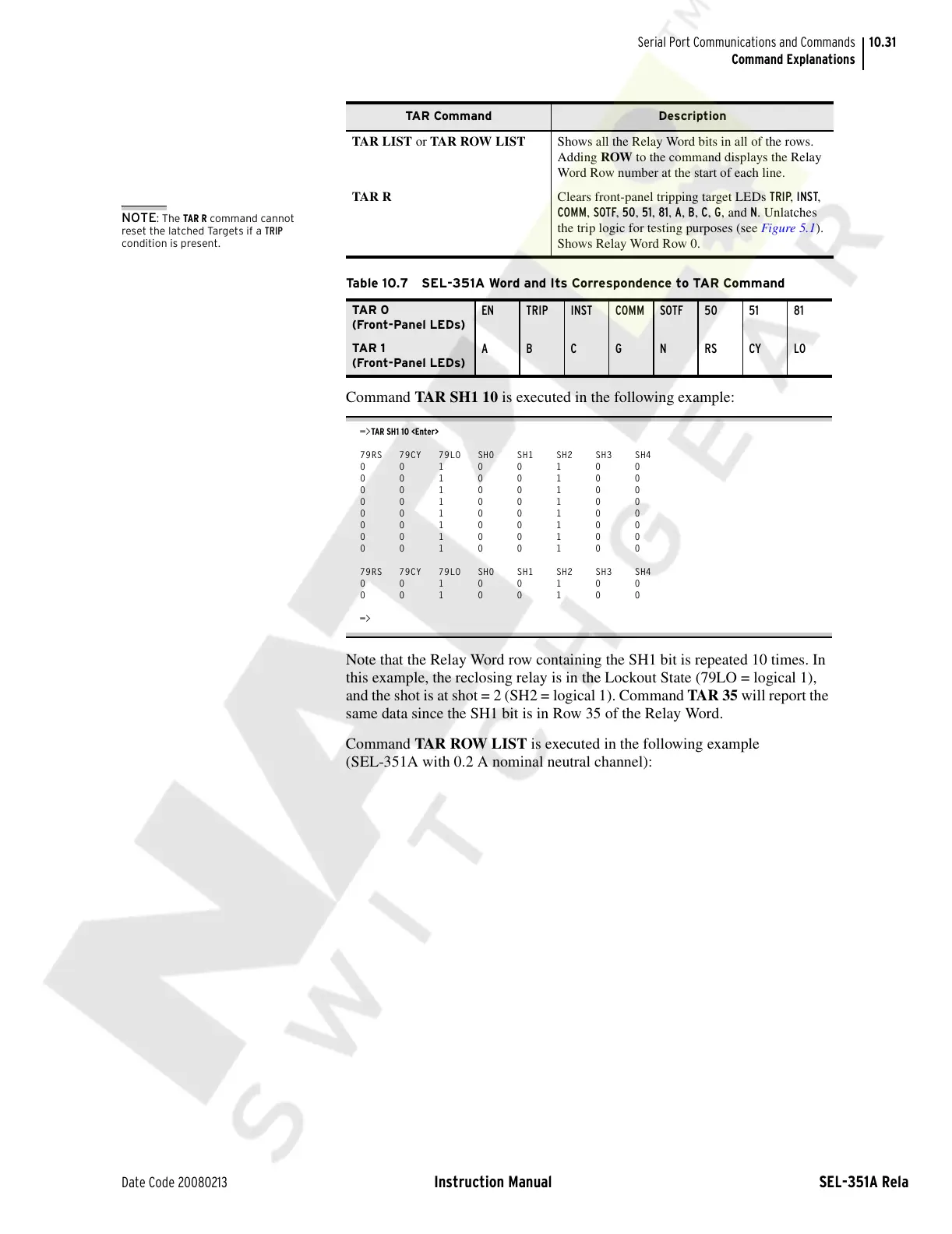 Table 10.7 SEL-351A Word and Its Correspondence to TAR Command