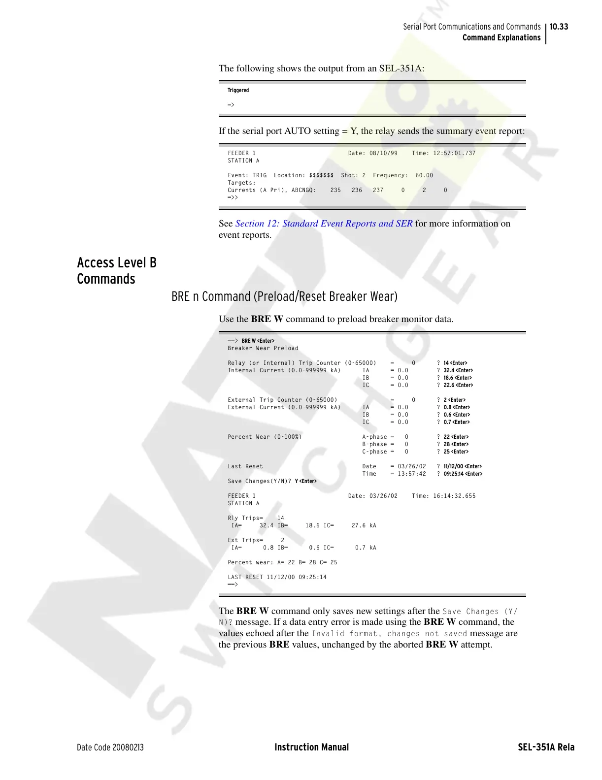 If the serial port AUTO setting = Y, the relay sends the summary event report: