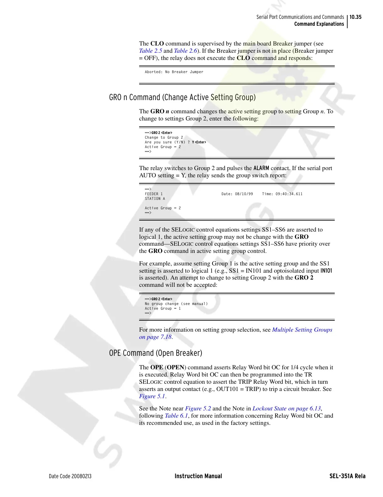 The GRO n command changes the active setting group to setting Group n. To