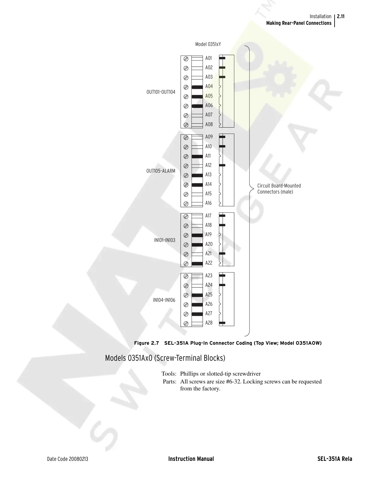 Figure 2.7 SEL-351A Plug-In Connector Coding (Top View; Model 0351A0W)