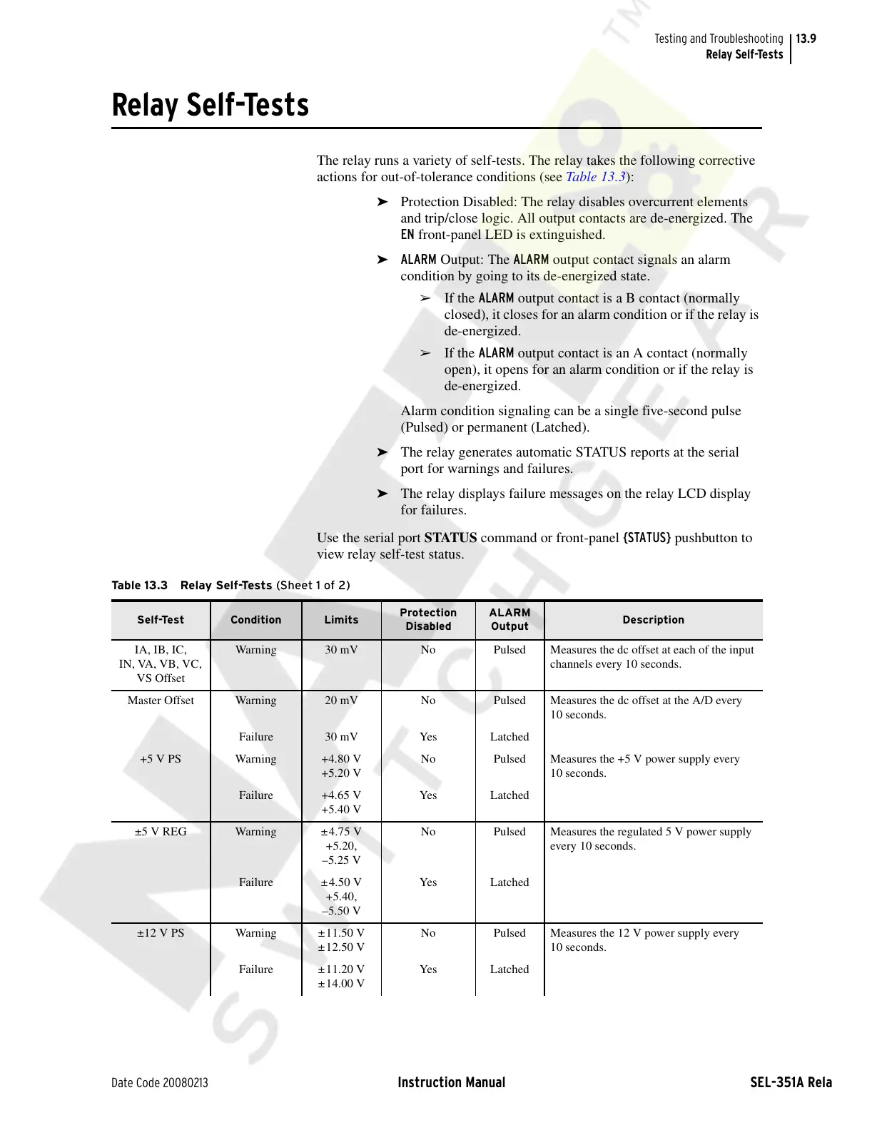 Table 13.3 Relay Self-Tests (Sheet 1 of 2)