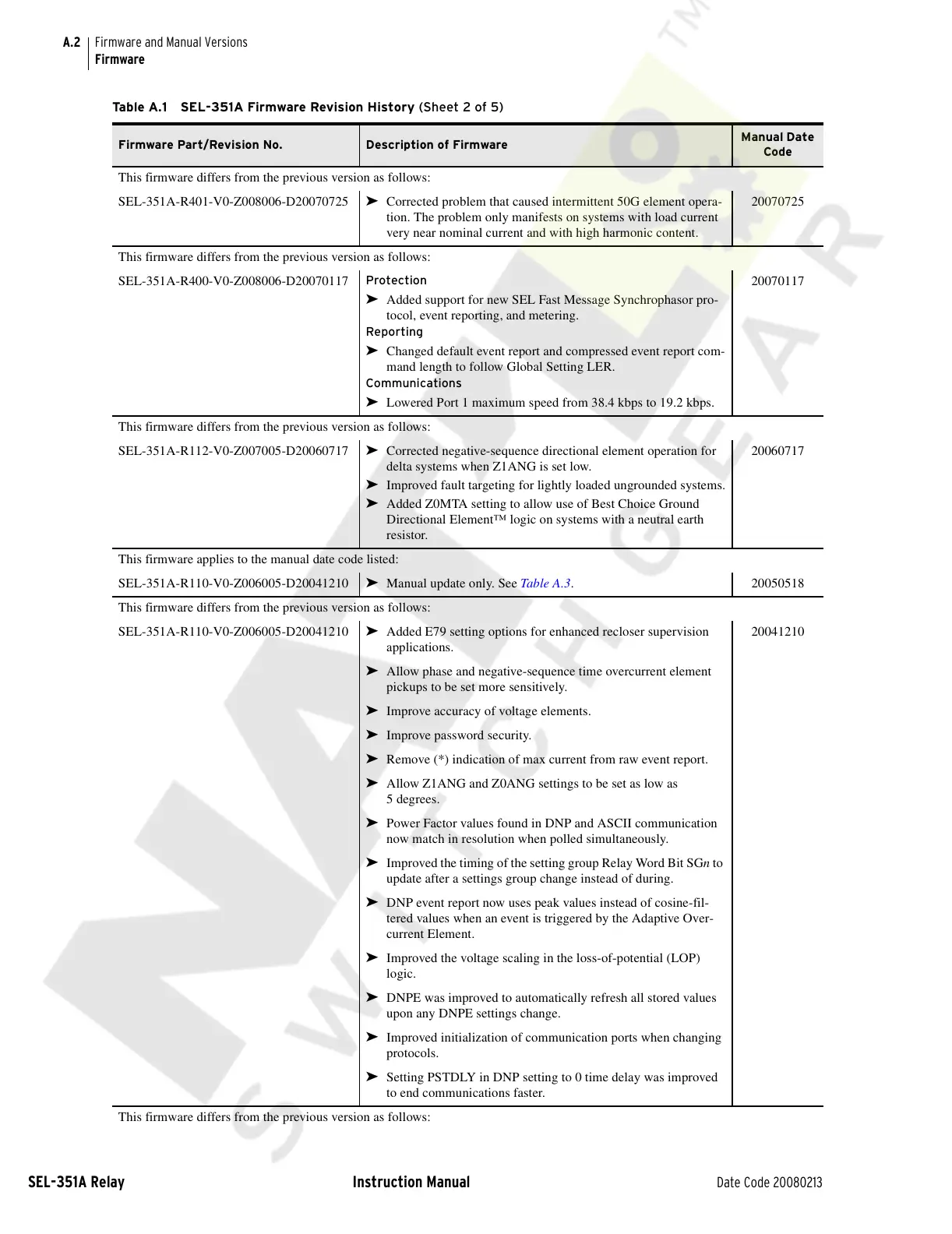 Table A.1 SEL-351A Firmware Revision History (Sheet 2 of 5)