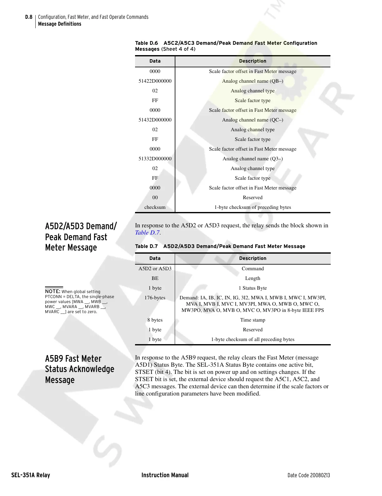 Table D.7 A5D2/A5D3 Demand/Peak Demand Fast Meter Message