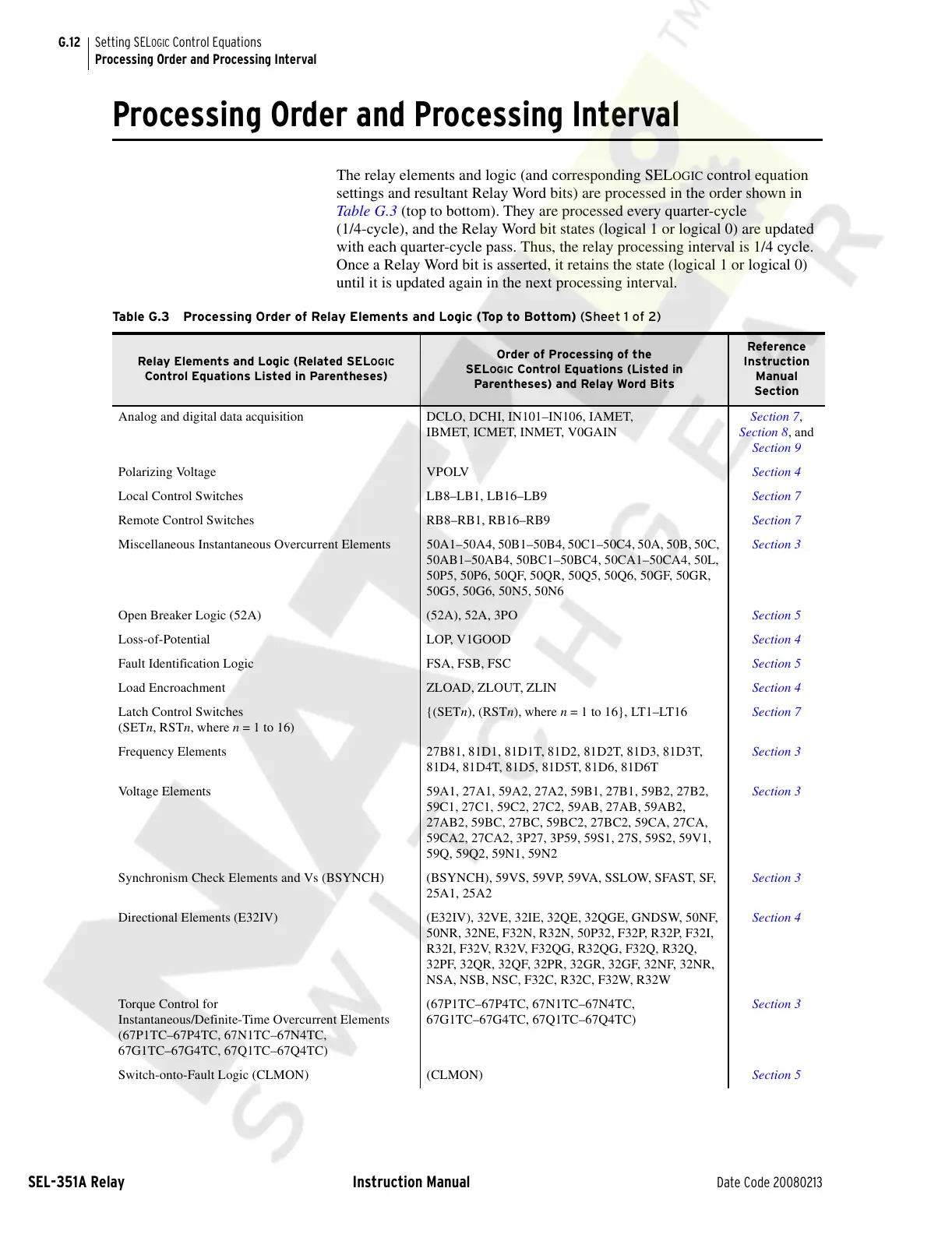 Table G.3 Processing Order of Relay Elements and Logic (Top to Bottom) (Sheet 1 of 2)