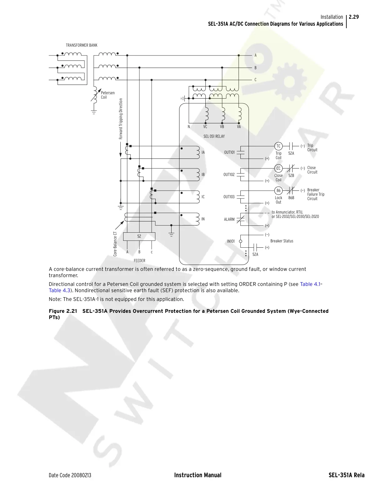 Figure 2.21 SEL-351A Provides Overcurrent Protection for a Petersen Coil Grounded System (Wye-Connected
