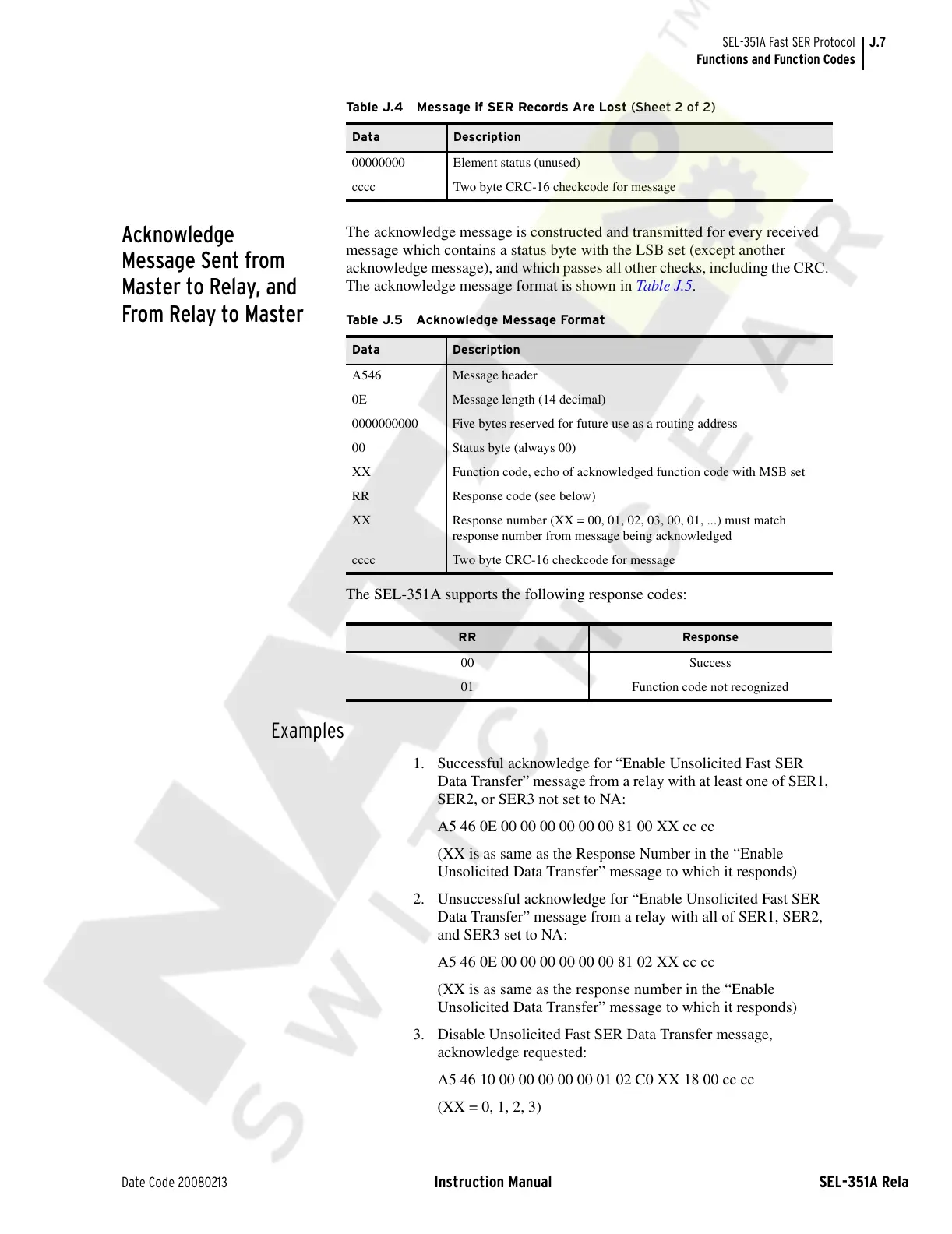 The SEL-351A supports the following response codes: