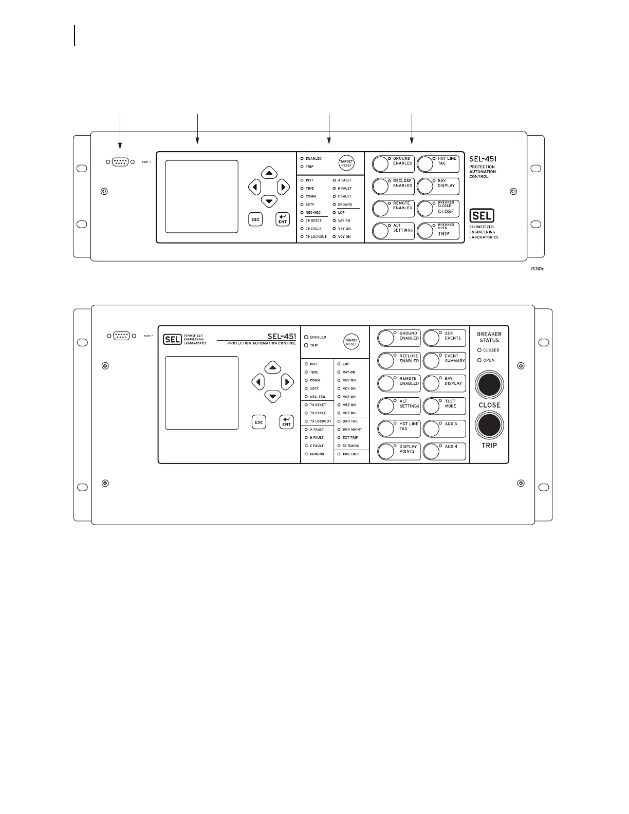 Figure 4.2 SEL-451 Front Panel (12-Pushbutton Model) with Optional Auxiliary Trip/Close Buttons