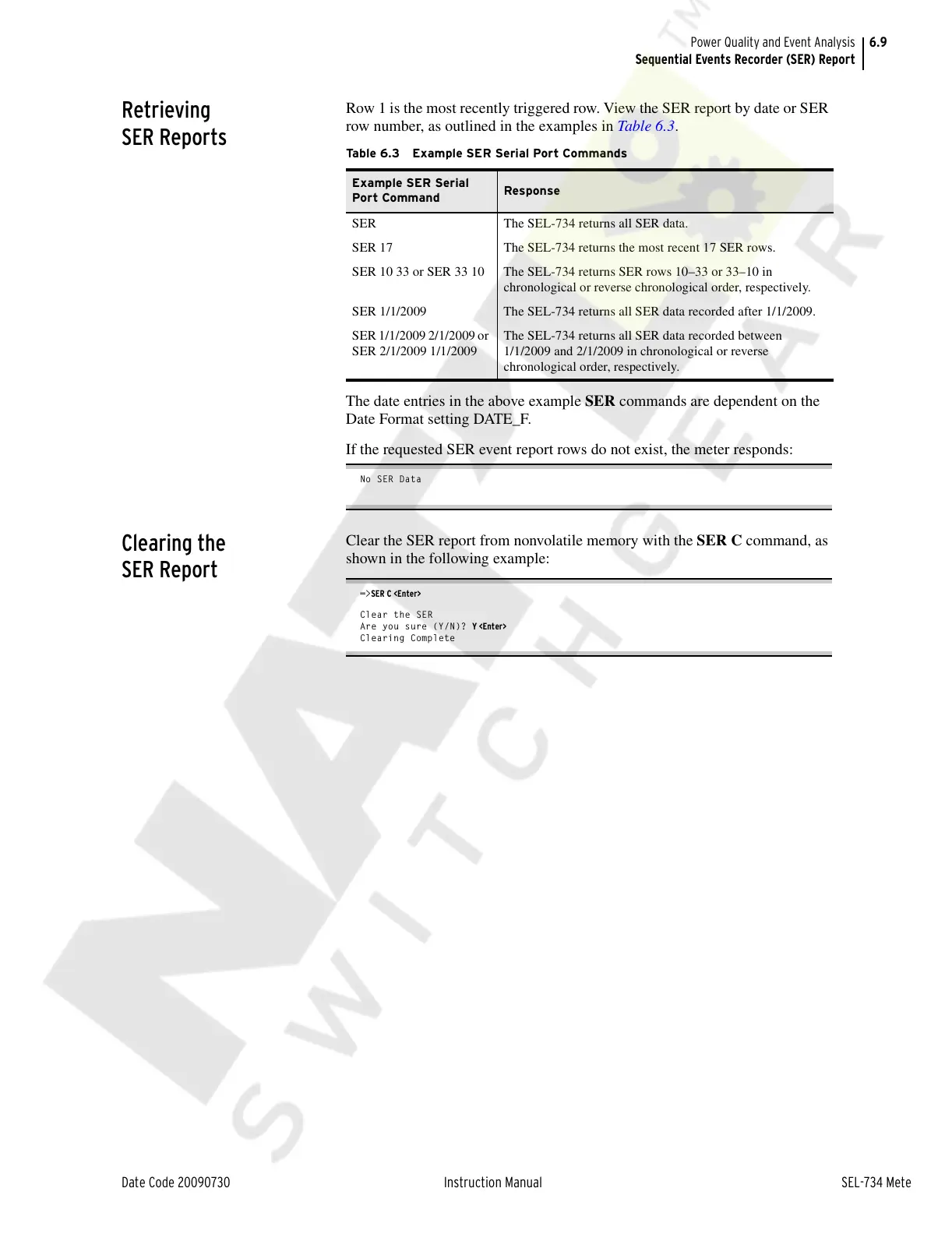 SER 1/1/2009 The SEL-734 returns all SER data recorded after 1/1/2009.