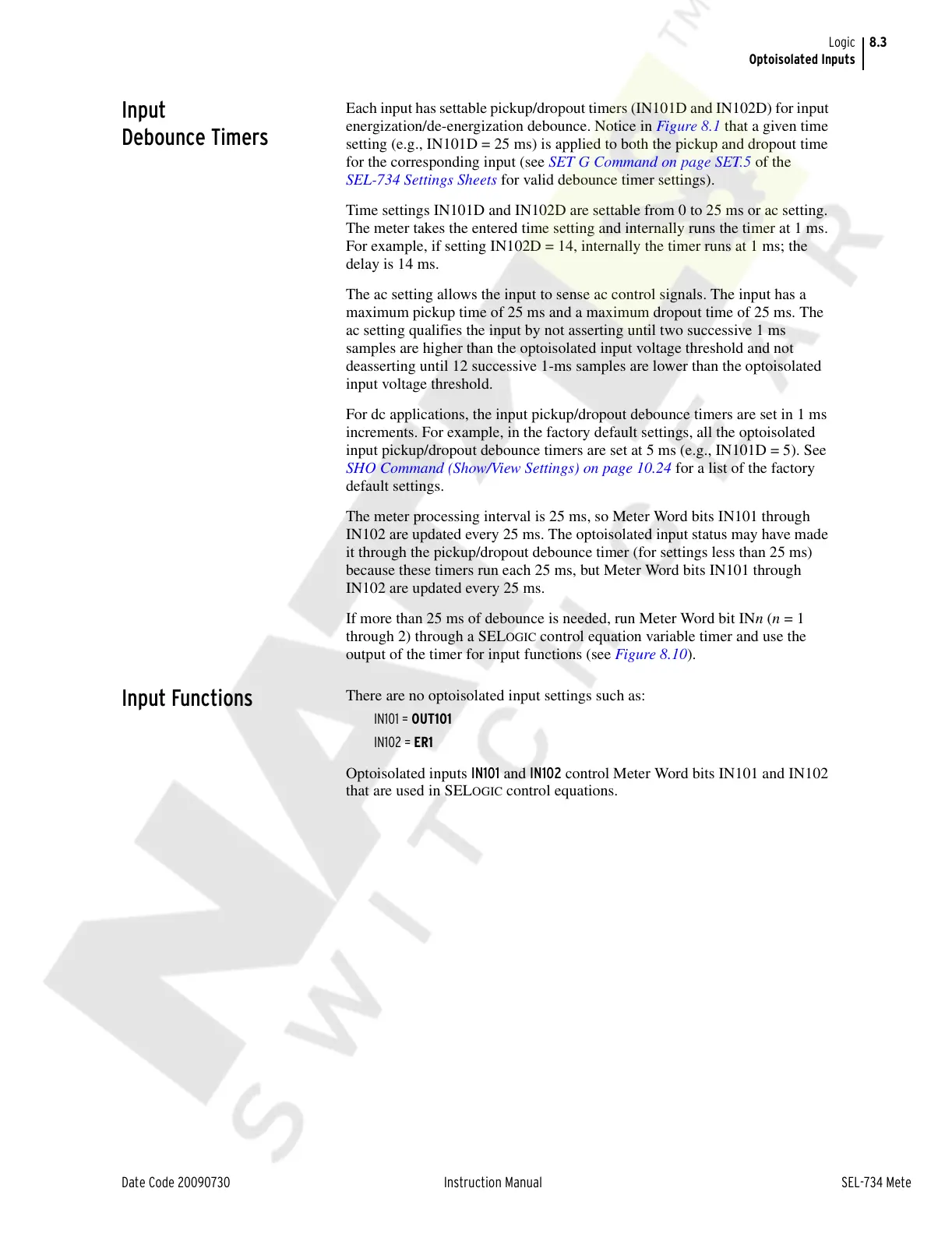 SEL-734 Settings Sheets for valid debounce timer settings).