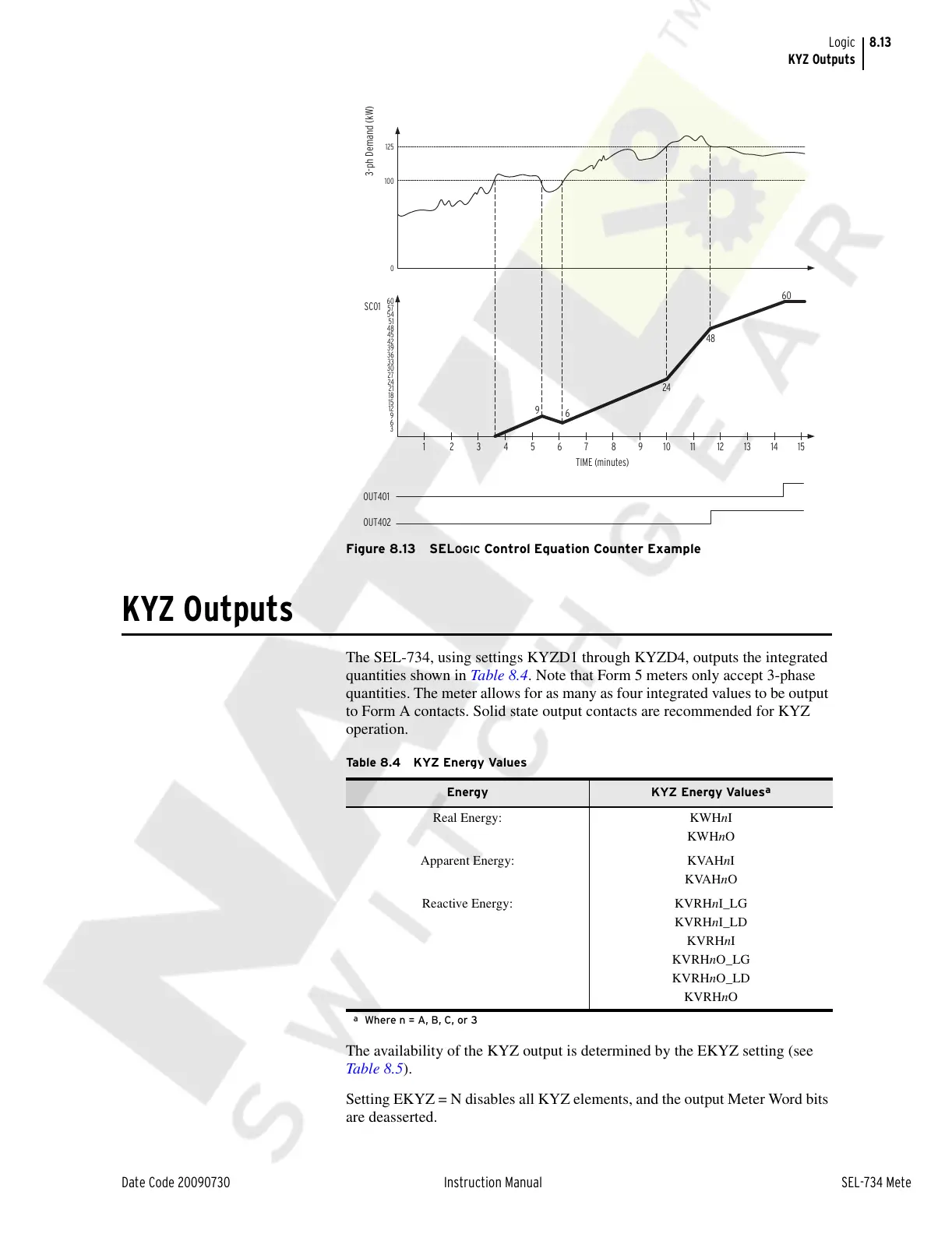The SEL-734, using settings KYZD1 through KYZD4, outputs the integrated