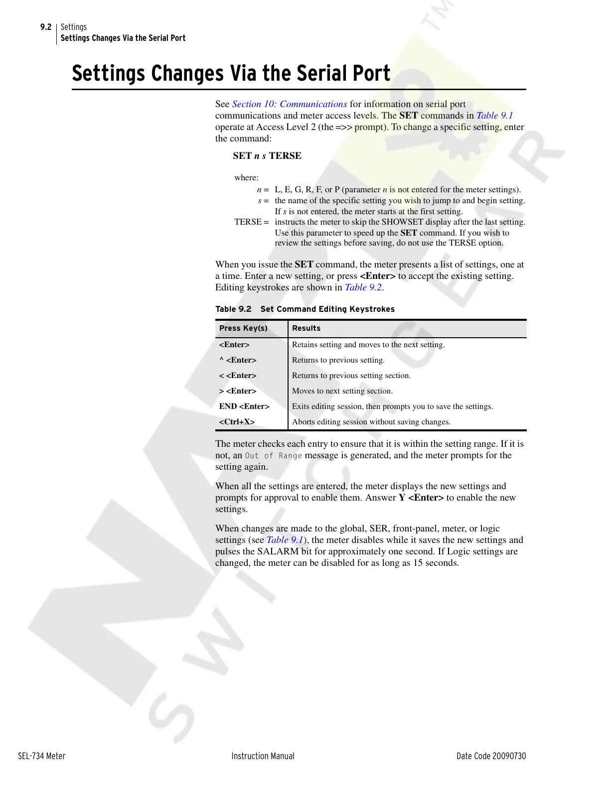 communications and meter access levels. The SET commands in Table 9.1