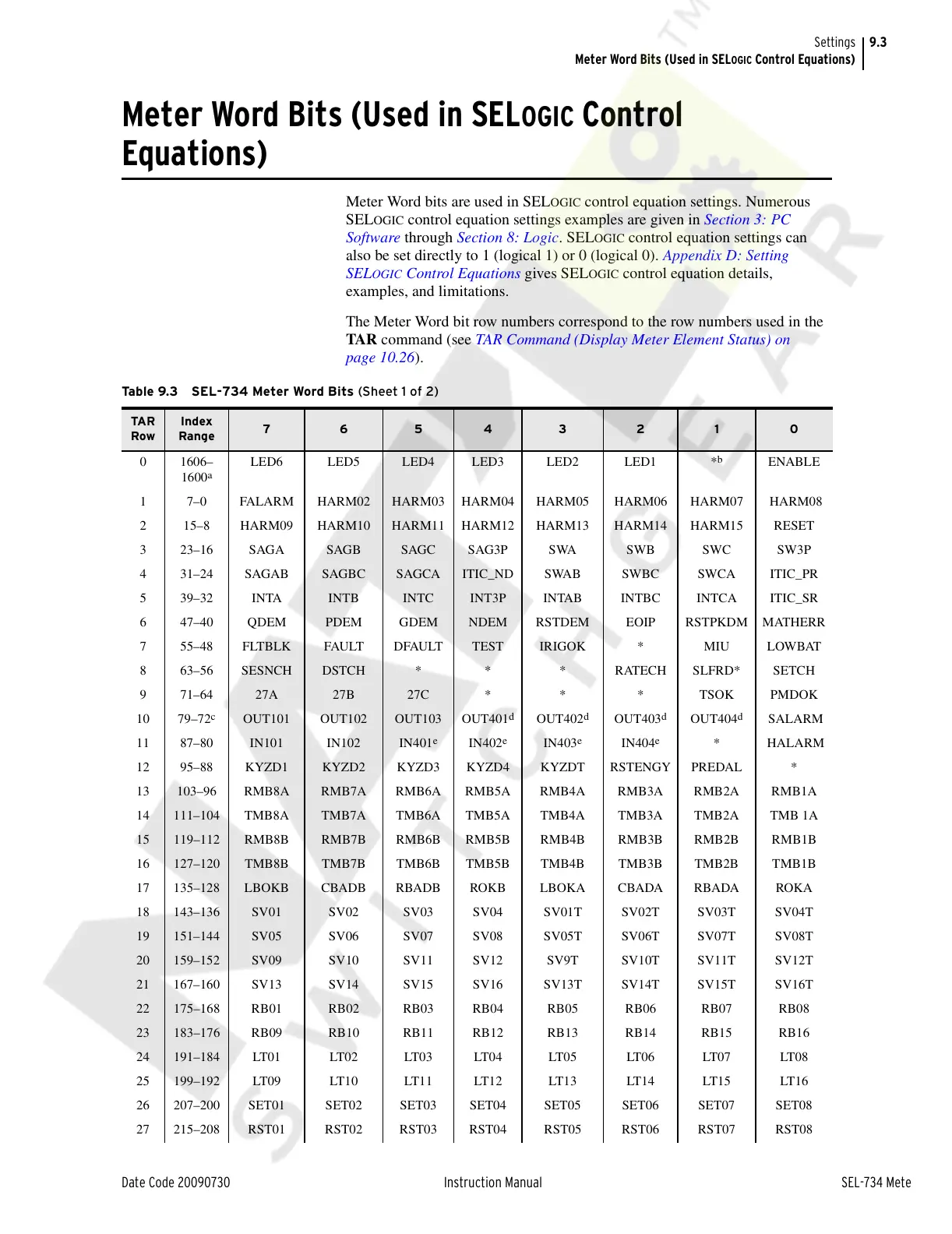 Ta b l e 9. 3 S E L - 7 3 4 M e t e r Wo rd B i t s (Sheet 1 of 2)