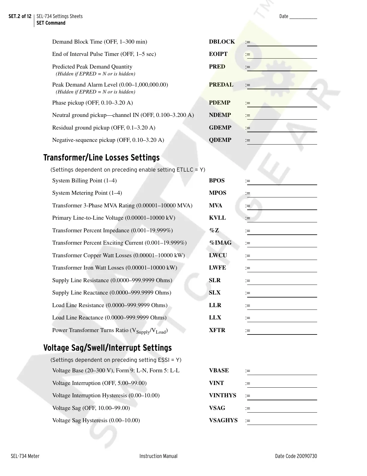 SET.2 of 12 SEL-734 Settings Sheets