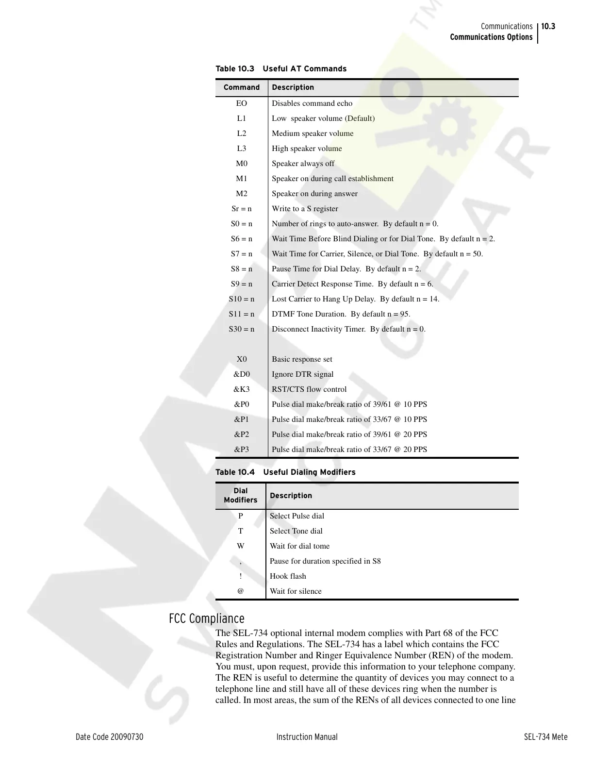 The SEL-734 optional internal modem complies with Part 68 of the FCC