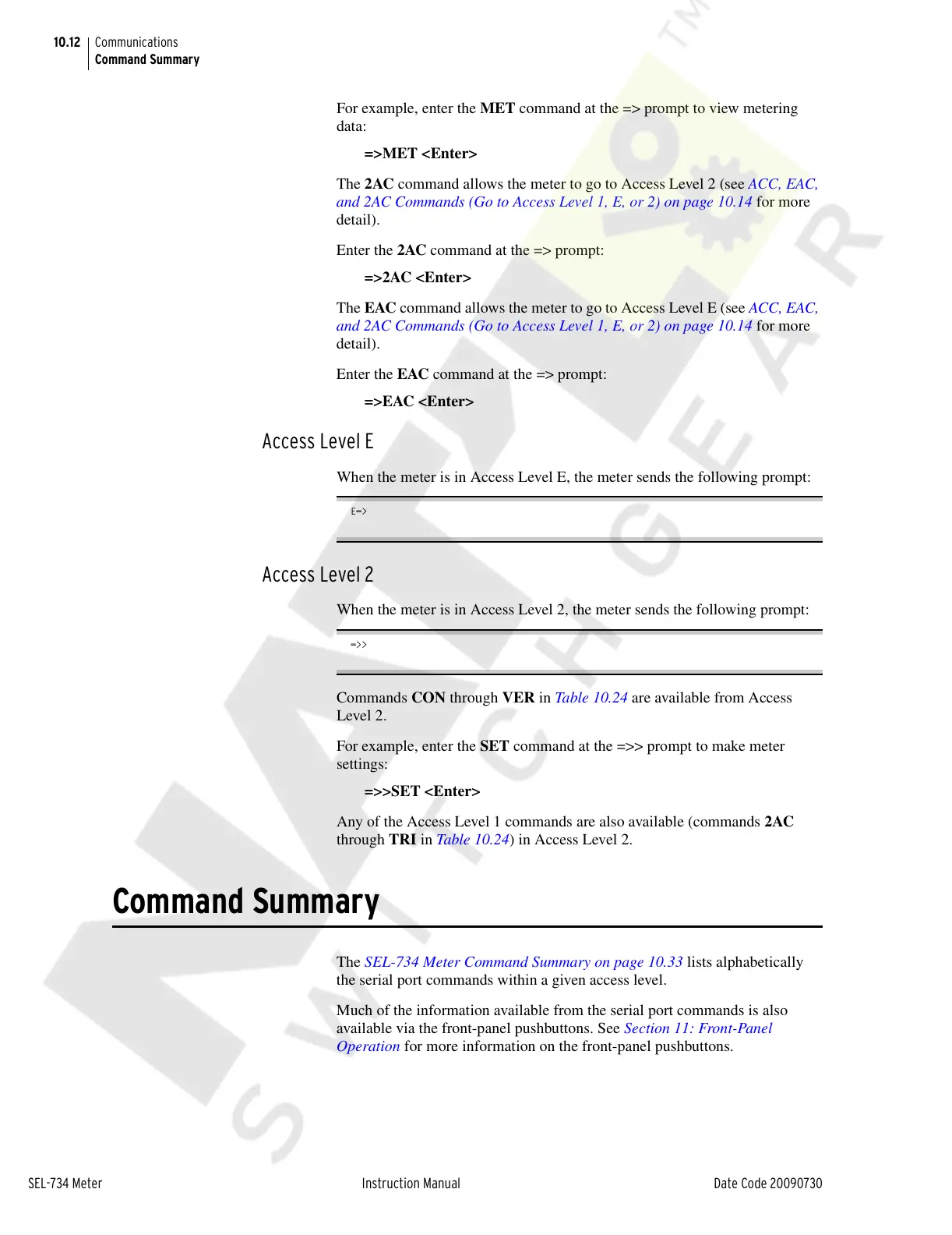 The SEL-734 Meter Command Summary on page 10.33 lists alphabetically