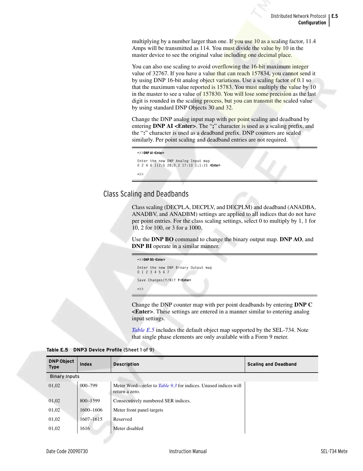 Table E.5 includes the default object map supported by the SEL-734. Note
