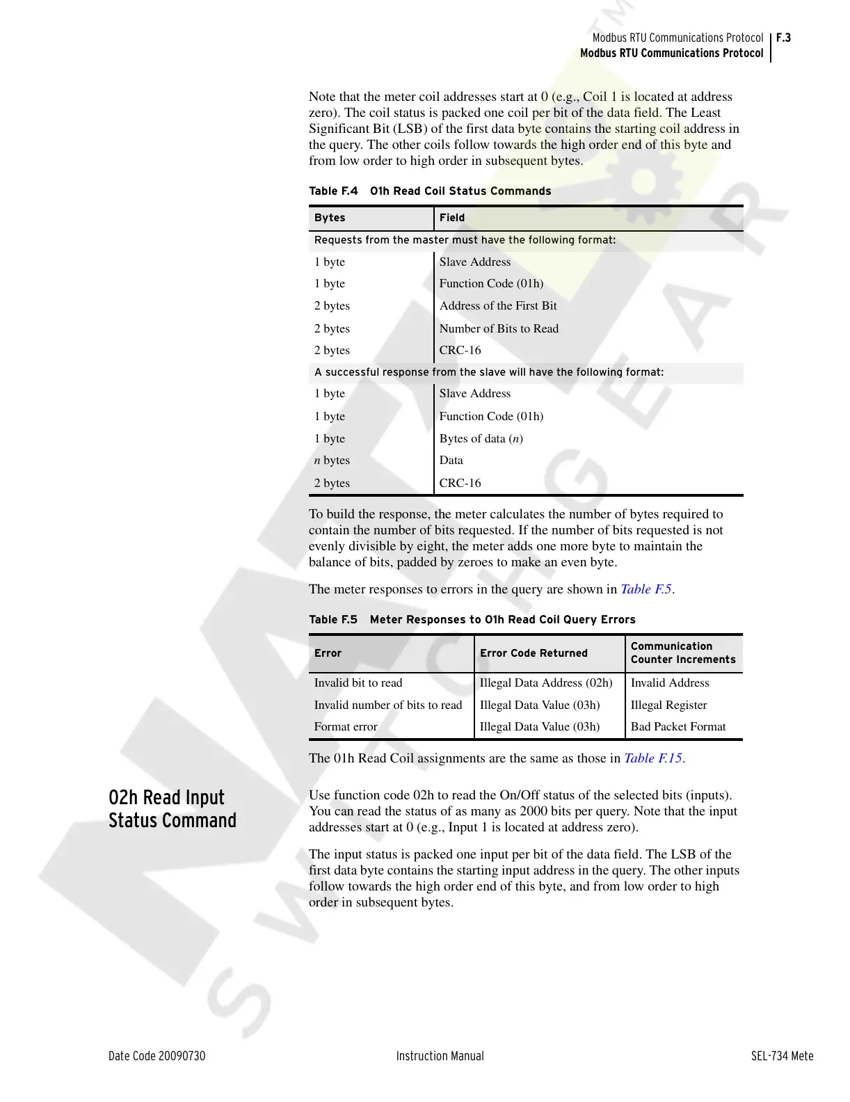 Table F.5 Meter Responses to 01h Read Coil Query Errors
