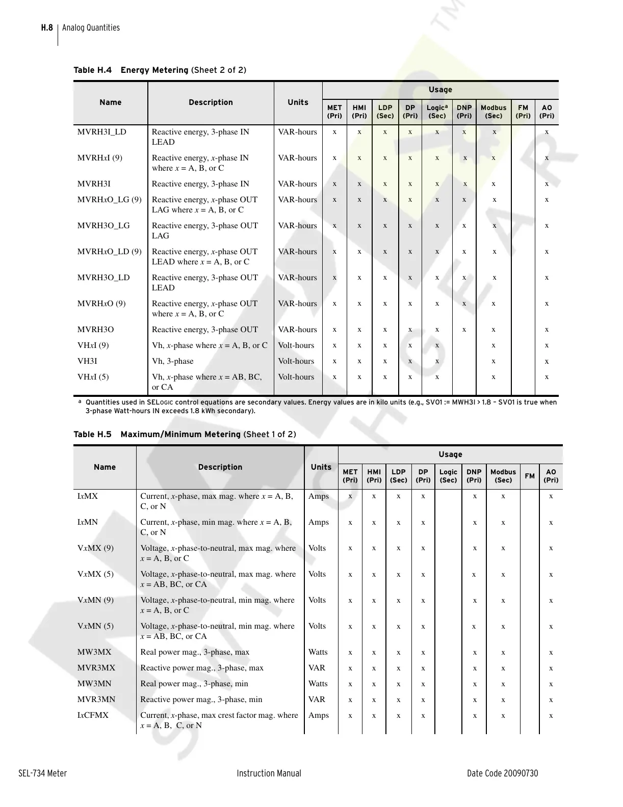 VHxI (9) Vh, x-phase where x = A, B, or C Volt-hours
