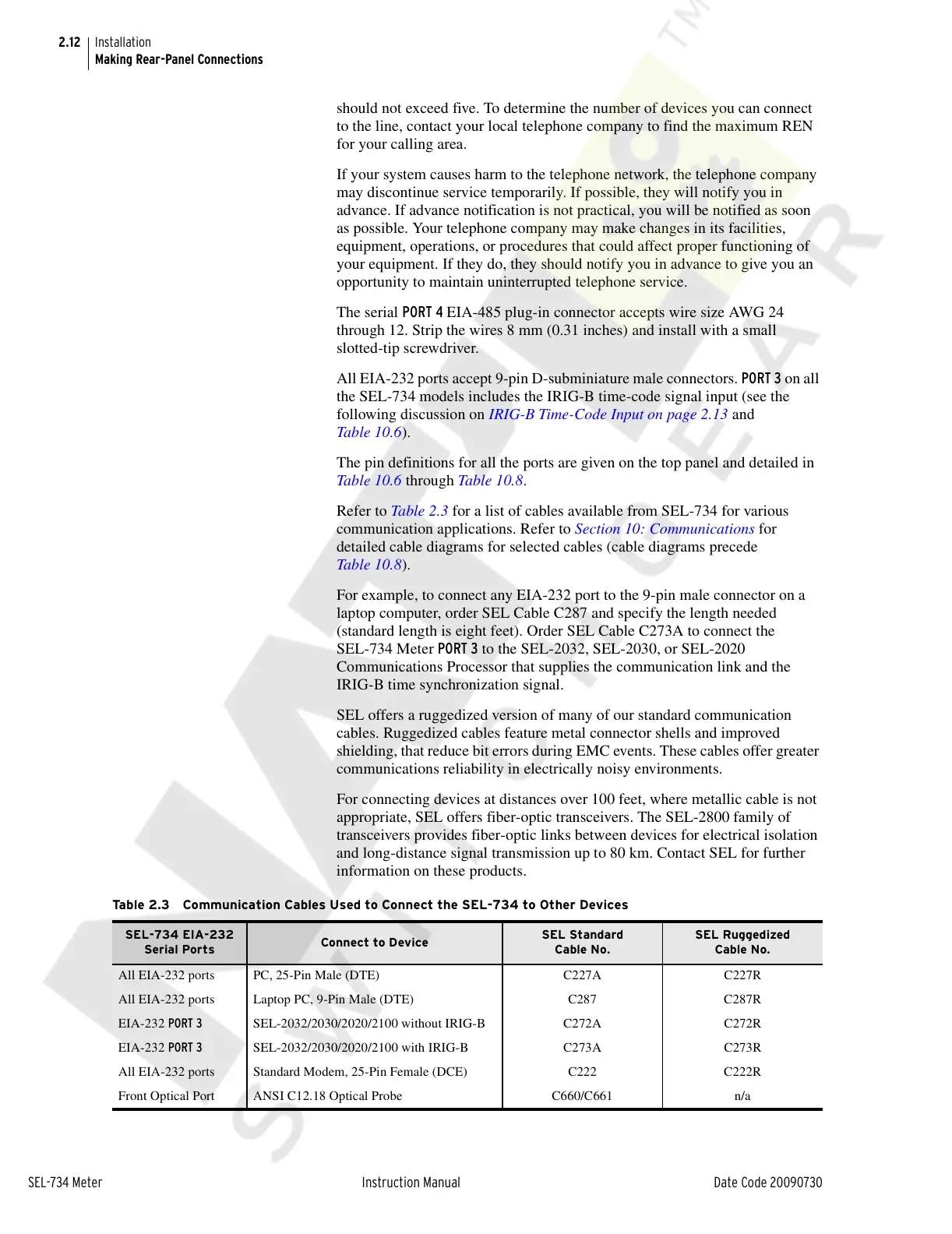 Table 2.3 Communication Cables Used to Connect the SEL-734 to Other Devices