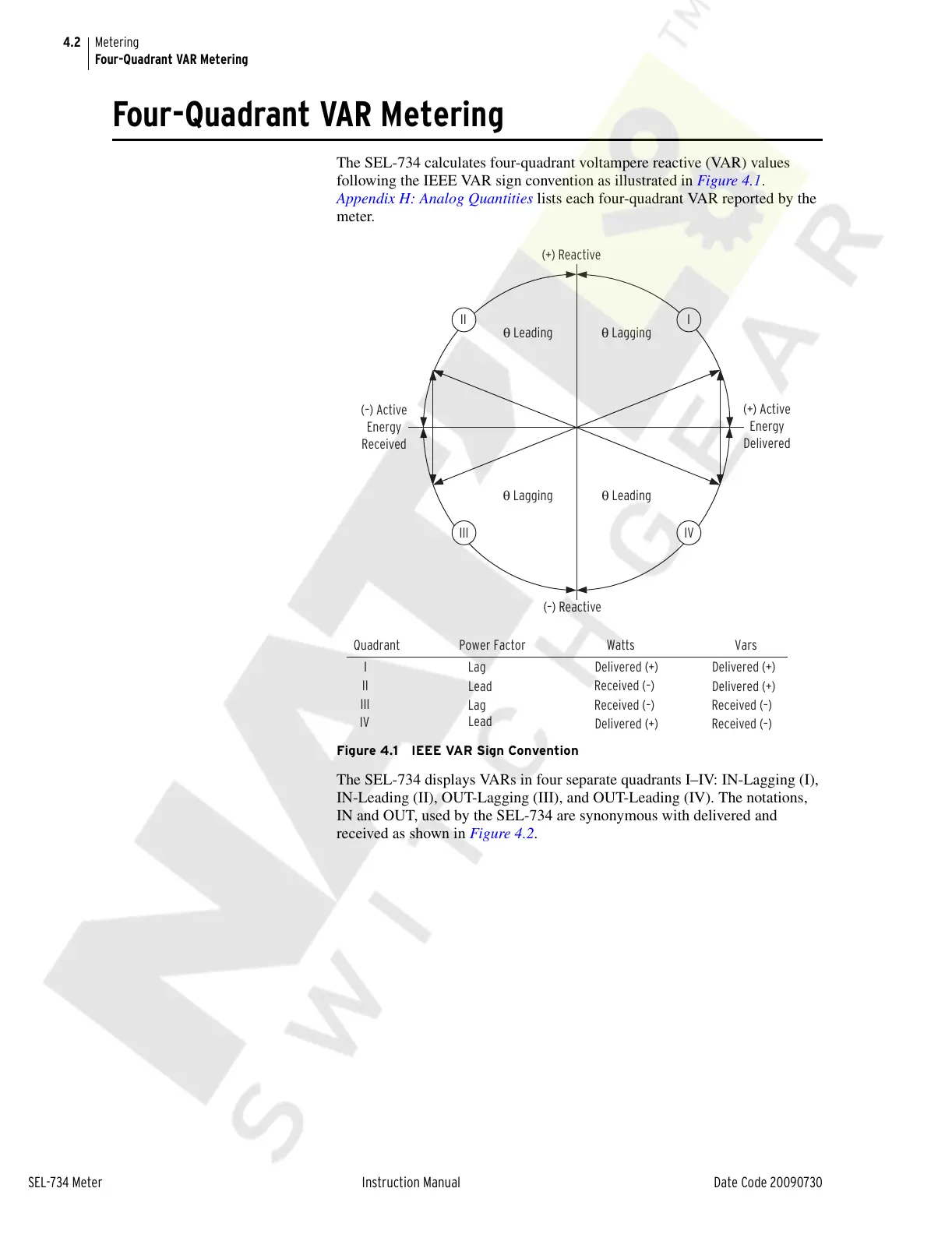 The SEL-734 displays VARs in four separate quadrants I–IV: IN-Lagging (I),