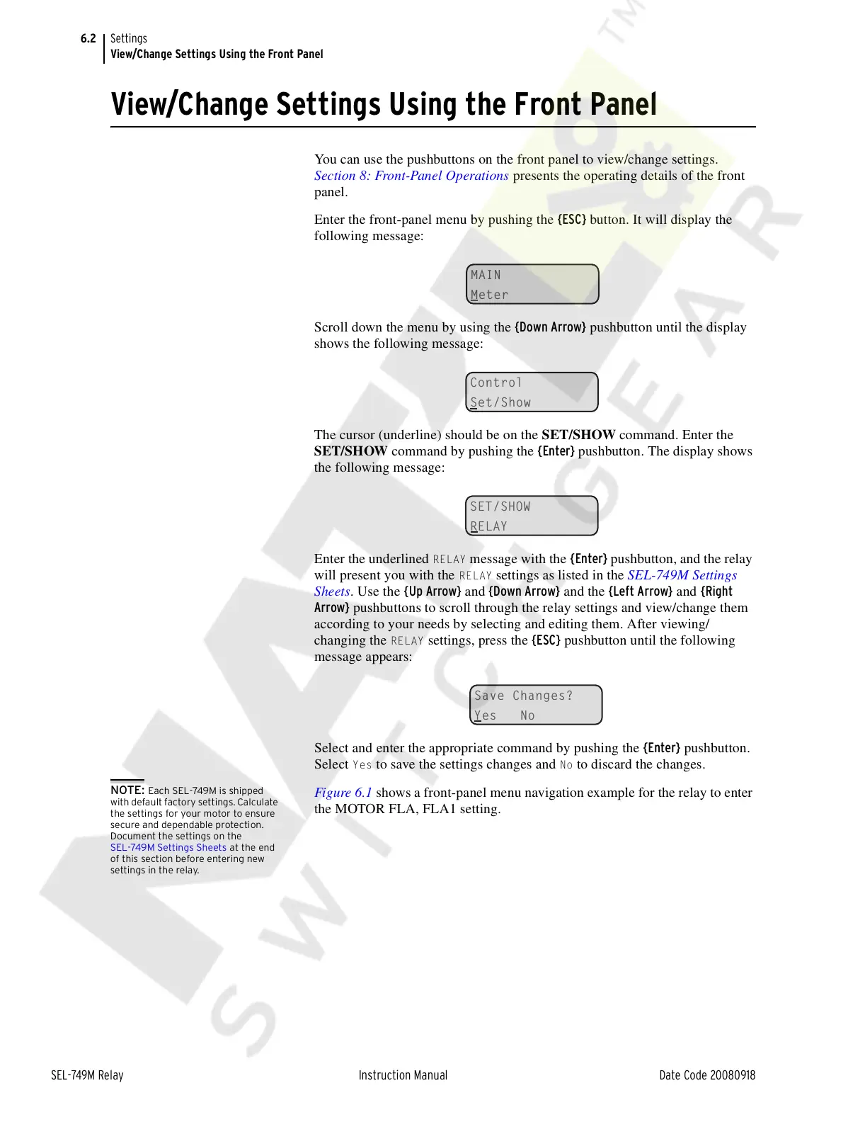 Figure 6.1 shows a front-panel menu navigation example for the relay to enter