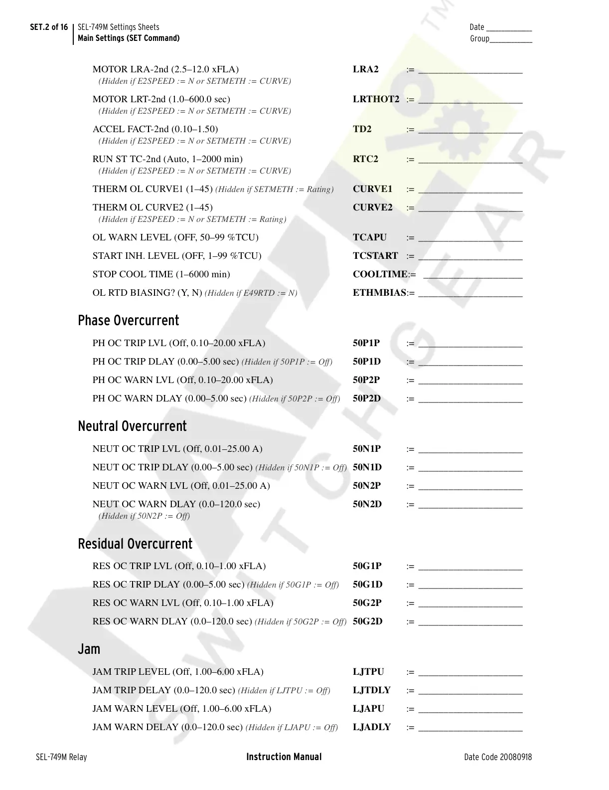 SET.2 of 16 SEL-749M Settings Sheets