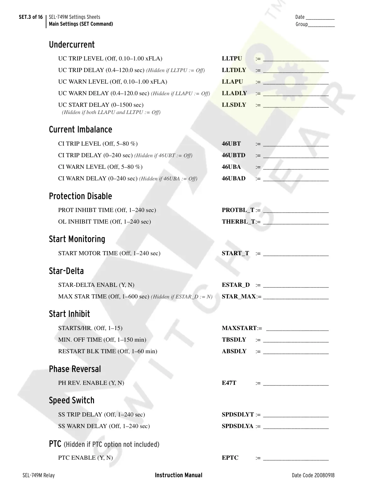 SET.3 of 16 SEL-749M Settings Sheets