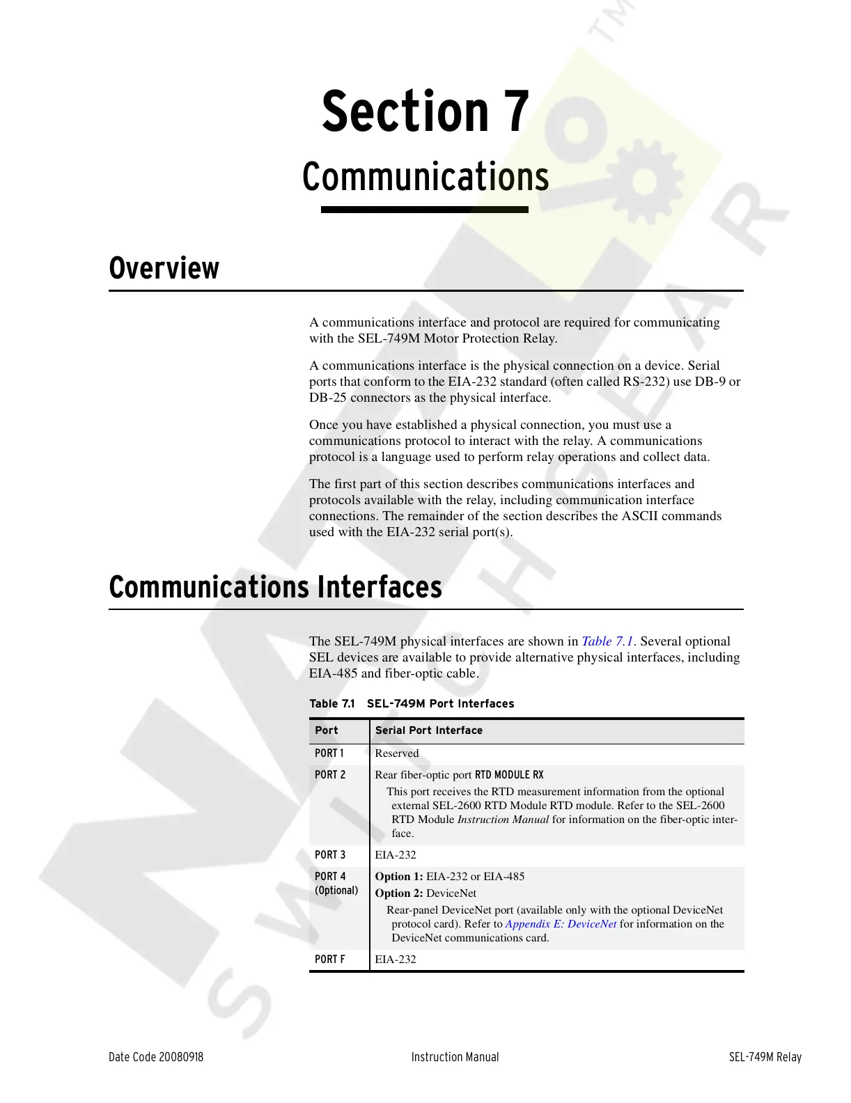 The SEL-749M physical interfaces are shown in Table 7.1. Several optional
