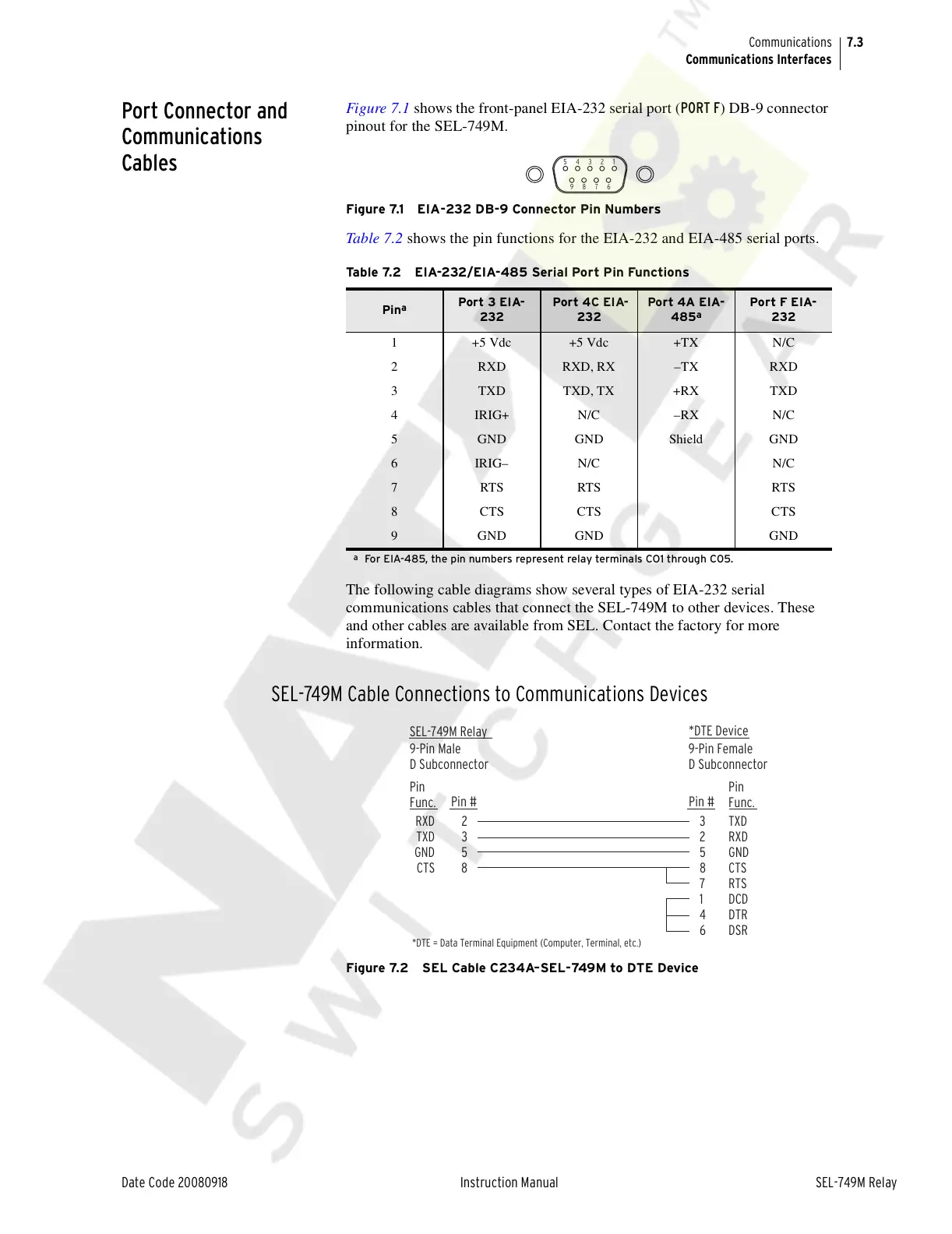 Figure 7.2 SEL Cable C234A–SEL-749M to DTE Device