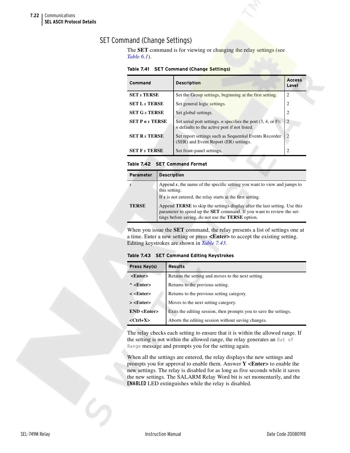 The SET command is for viewing or changing the relay settings (see