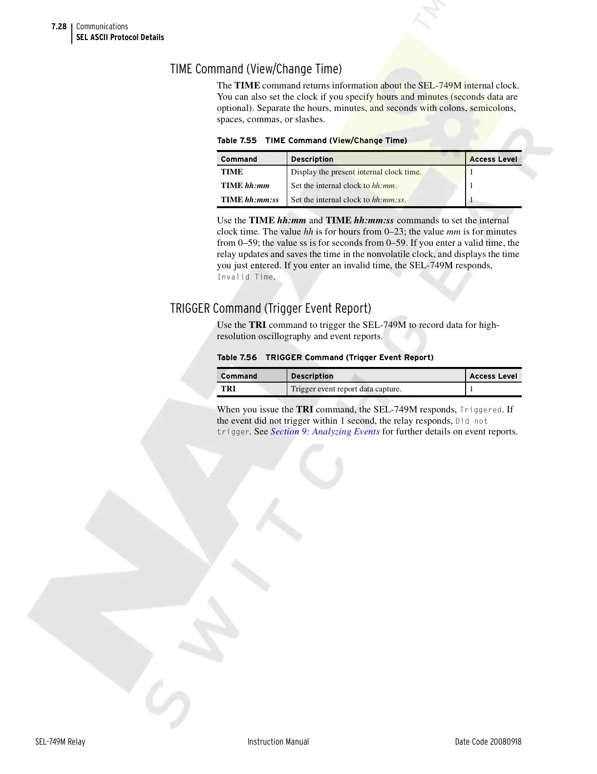 When you issue the TRI command, the SEL-749M responds,