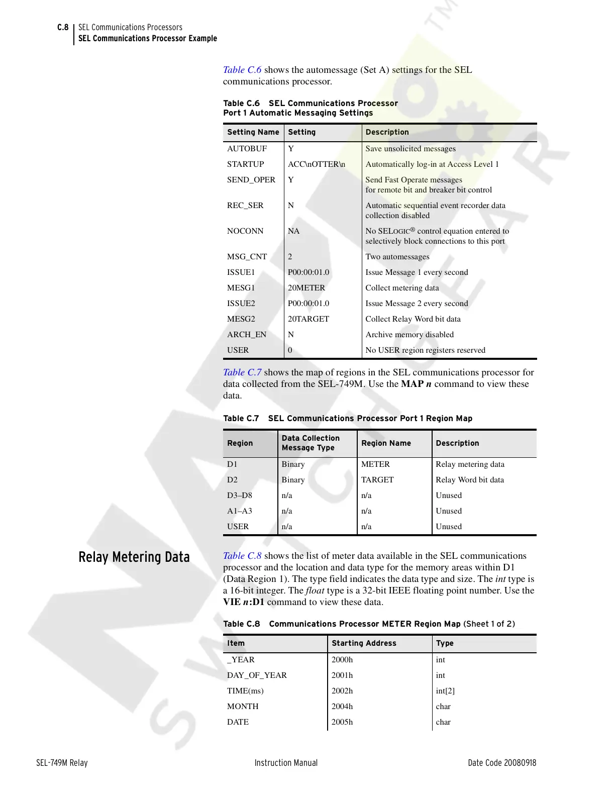 Table C.6 shows the automessage (Set A) settings for the SEL