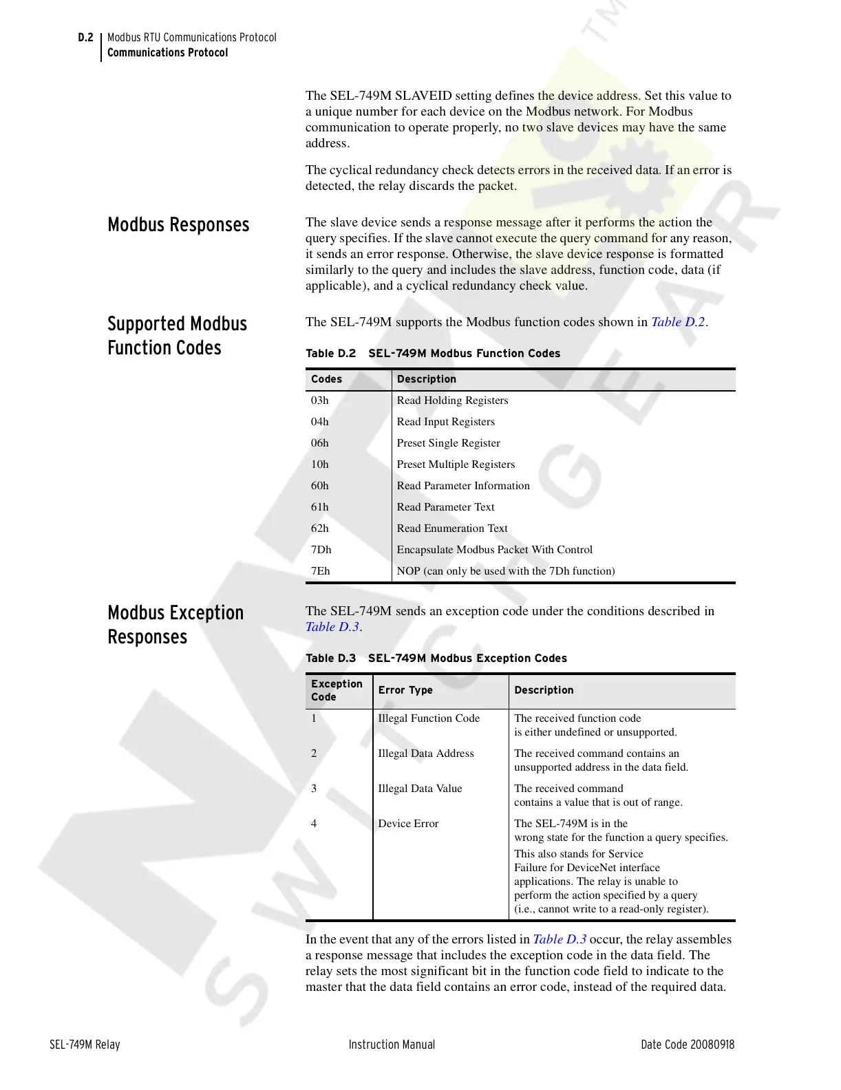 Table D.3 SEL-749M Modbus Exception Codes