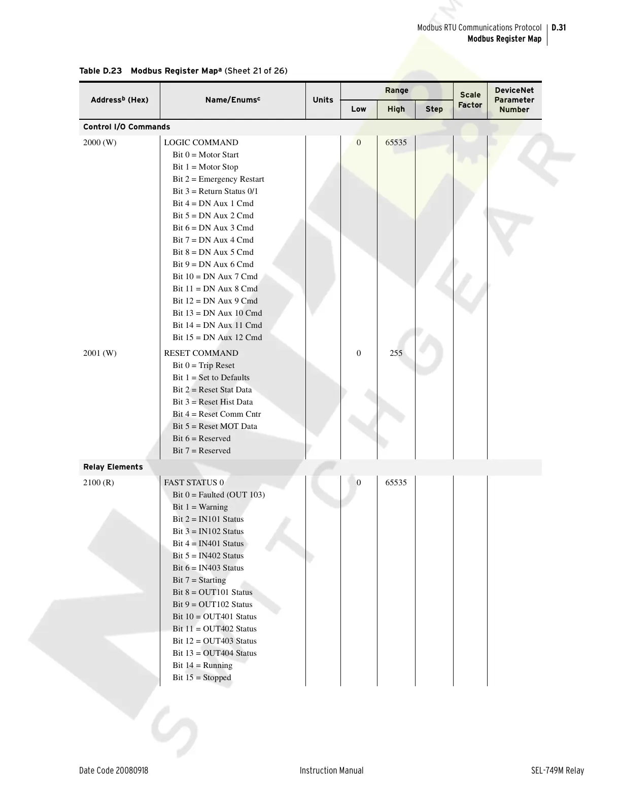 Table D.23 Modbus Register Map