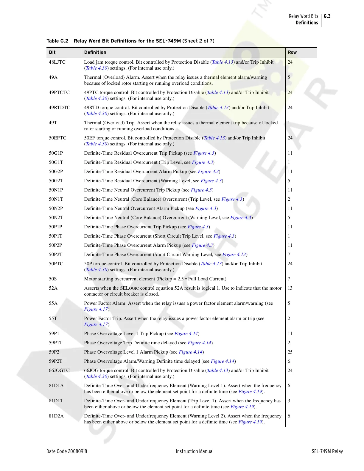 Table G.2 Relay Word Bit Definitions for the SEL-749M (Sheet 2 of 7)