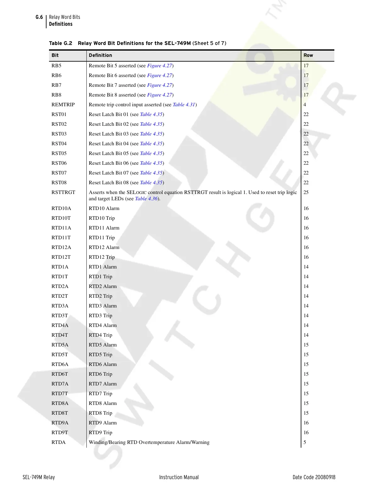 Table G.2 Relay Word Bit Definitions for the SEL-749M (Sheet 5 of 7)