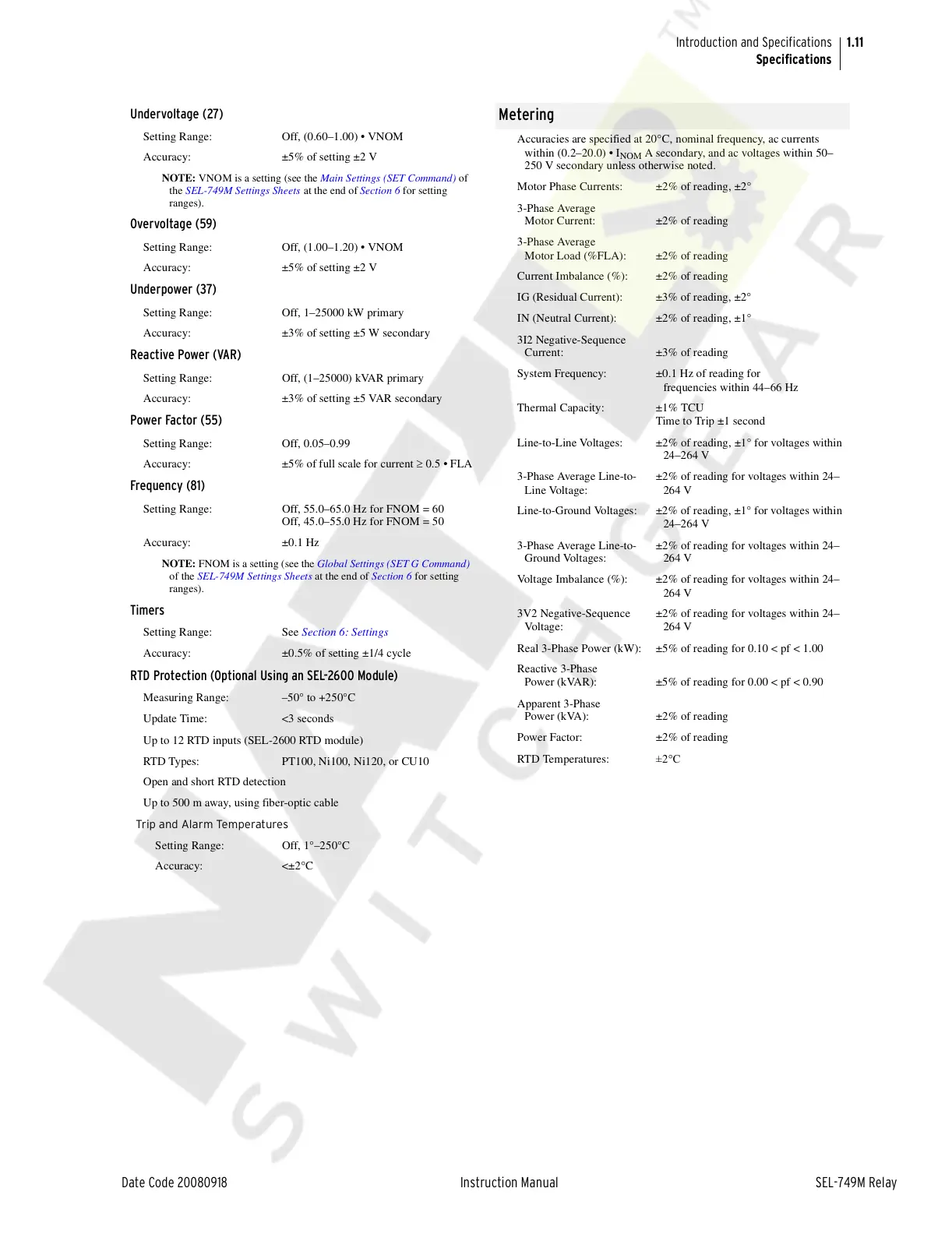 Accuracy: ±3% of setting ±5 W secondary