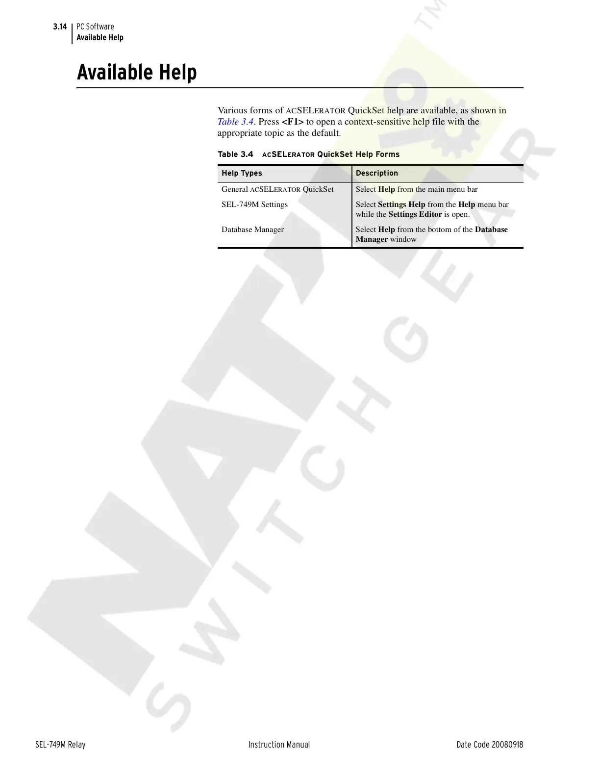 SEL-749M Settings Select Settings Help from the Help menu bar