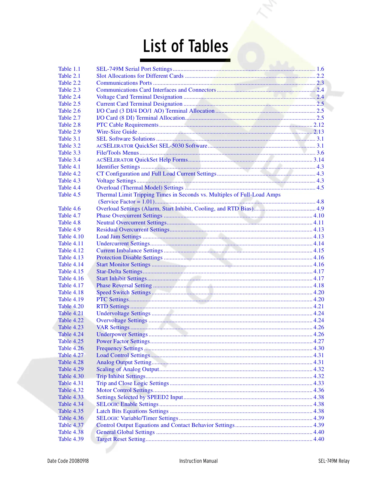 Table 4.7 Phase Overcurrent Settings .................................................................................................. 4.10