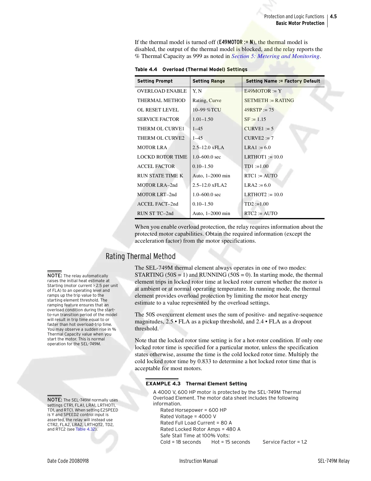 A 4000 V, 600 HP motor is protected by the SEL-749M Thermal
