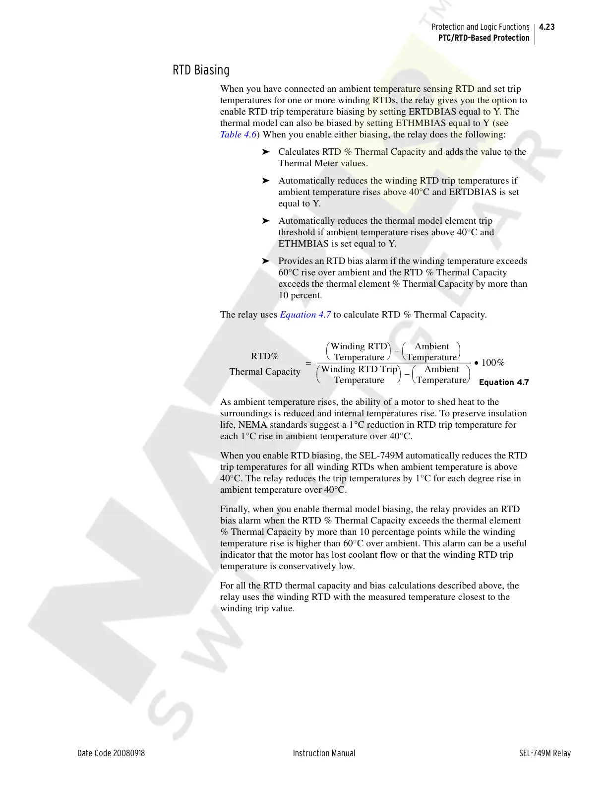 The relay uses Equation 4.7 to calculate RTD % Thermal Capacity.