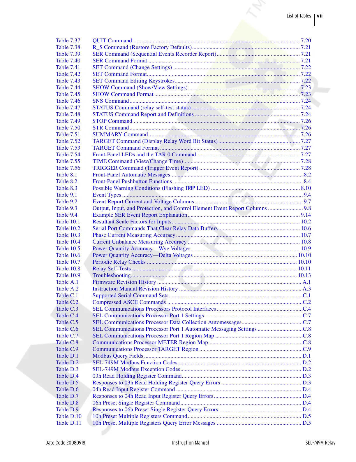 Table 7.47 STATUS Command (relay self-test status) .......................................................................... 7.24