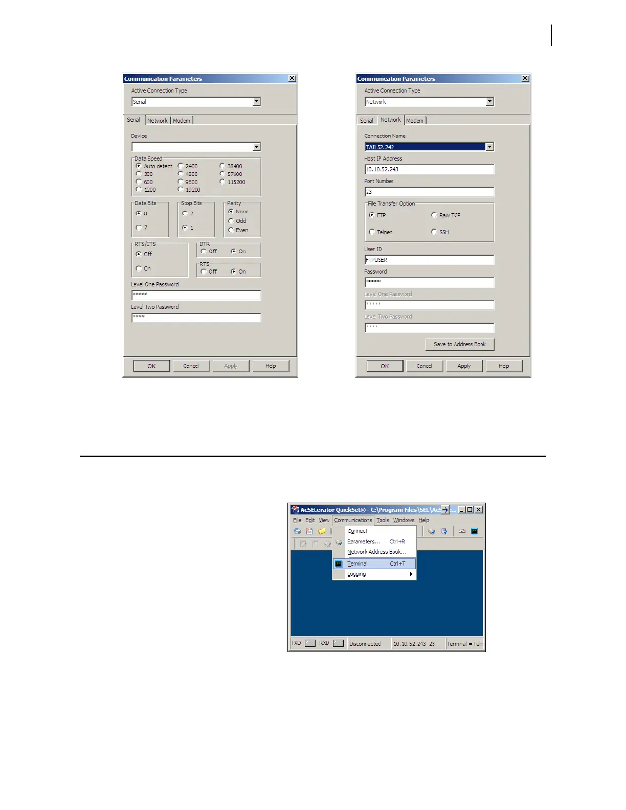 Select Communications > Terminal on the ACSELERATOR QuickSet main