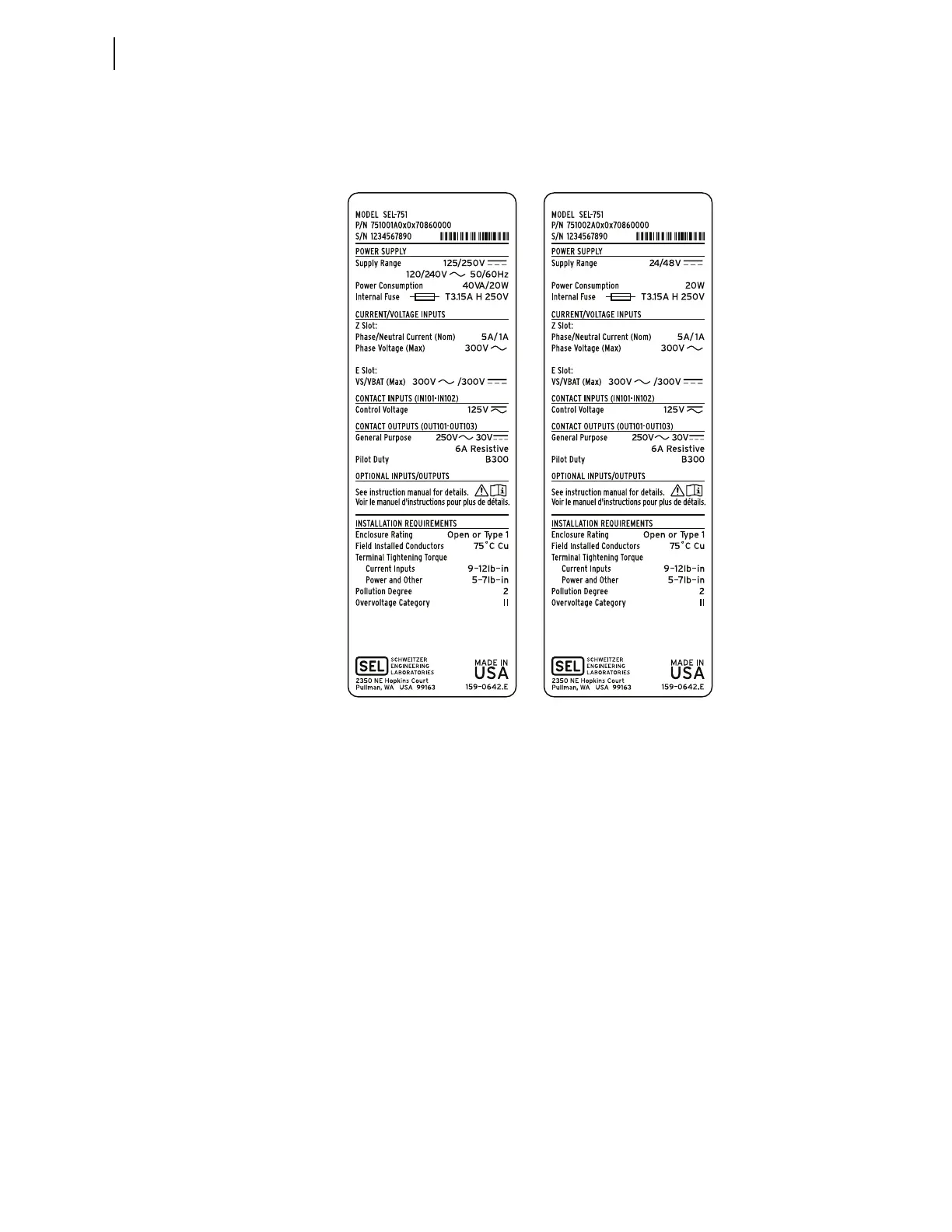Product Labels for the SEL-751 With the Two-Line Display