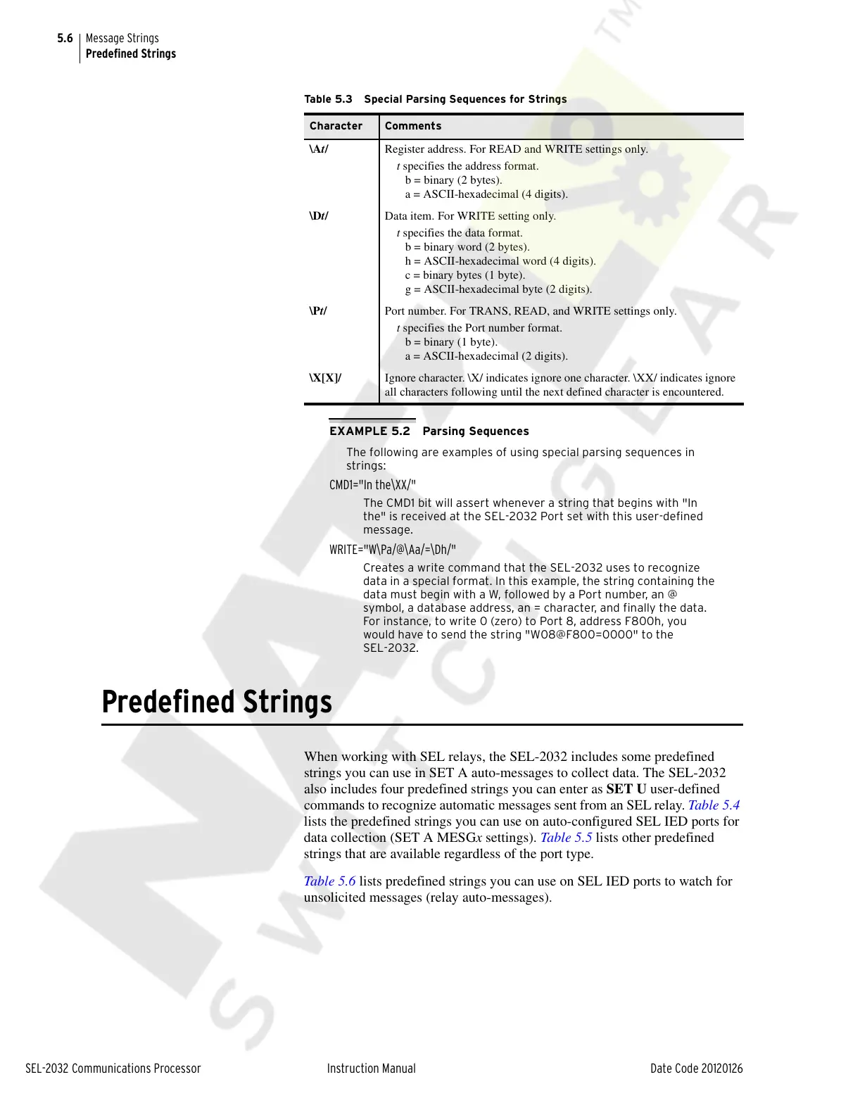 Table 5.6 lists predefined strings you can use on SEL IED ports to watch for