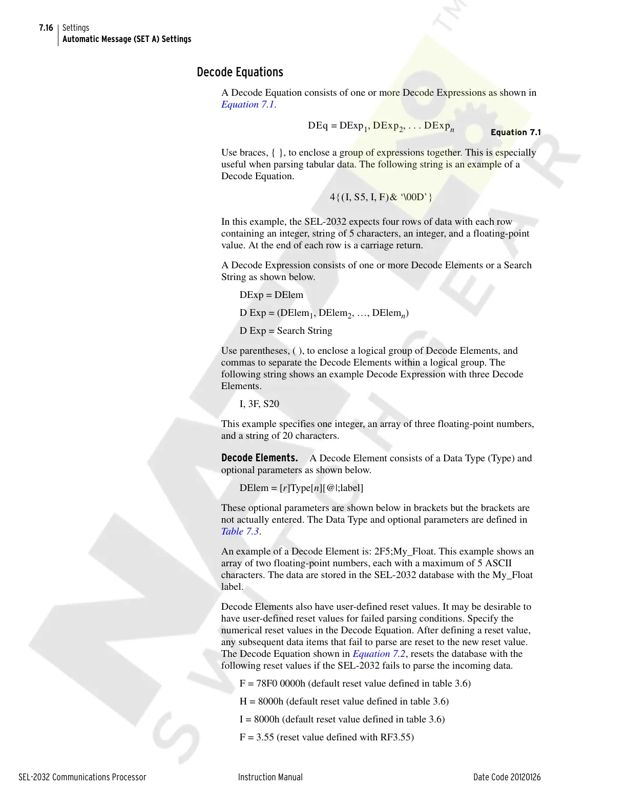 following reset values if the SEL-2032 fails to parse the incoming data.