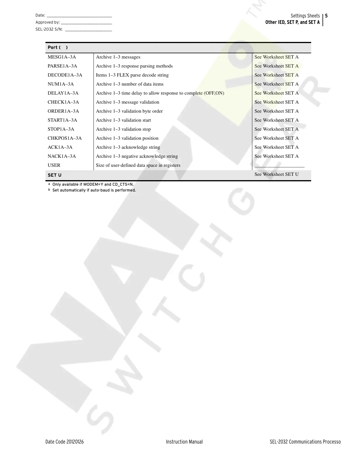 DELAY1A–3A Archive 1–3 time delay to allow response to complete (OFF,ON) See Worksheet SET A