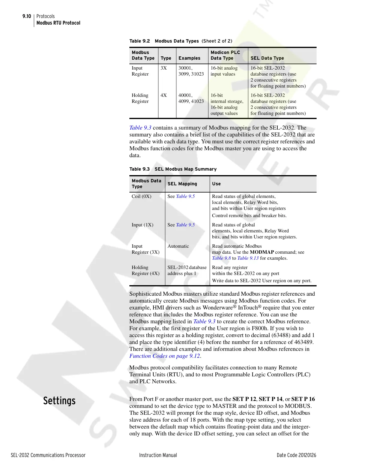 Table 9.3 contains a summary of Modbus mapping for the SEL-2032. The
